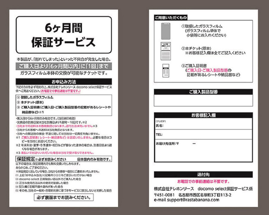 180日以内に本製品が破損してしまった場合は、新しいガラスフィルムハイグレードと交換が可能です。